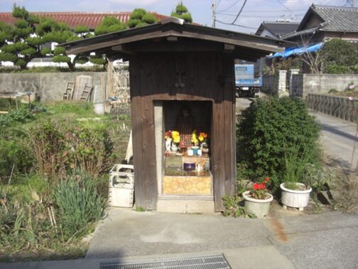 2号線に合流する手前右の斜面に見落としそうな小さな お地蔵さん すぐ岩徳線を路線橋で越えます。2号線に合流横断して左(東)側の細い側道を次の信号まで進みます。信号の左側に勝間郵便局があります
