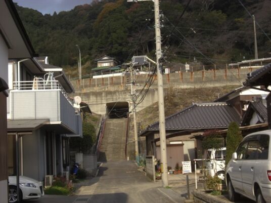 祠のところで右に下ると、その下を岩徳線が地下のトンネルで抜けていて、正面に2号線があります