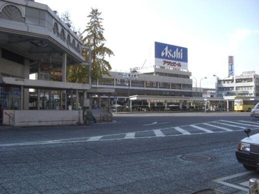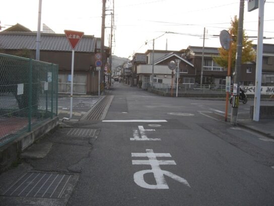 さらに右に岩崎酒店、左に周南市勝いセンタ―を見て140m程の先で広い道の交差点に出ます