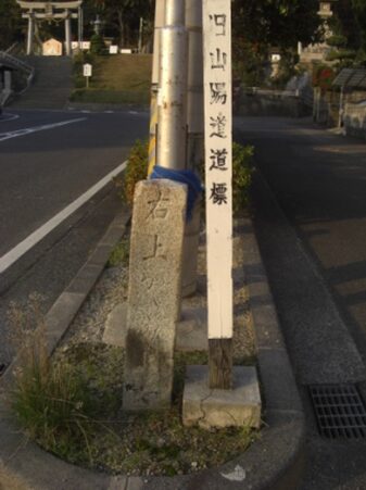 右に折れる右角に山陽道標柱 道標 「右 上かたみち 左 下のせきみち」