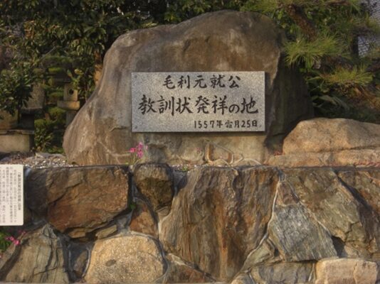 その時、元就は長男隆元、二男元春、三男隆景にあて、各自毛利家の為に一致協力して毛利を支える事を論した十四か条にわたる教訓状(三矢の訓)を認めたと伝わる。現在、この教訓状は国の重文として、毛利博物館(防府市)に所蔵されています
