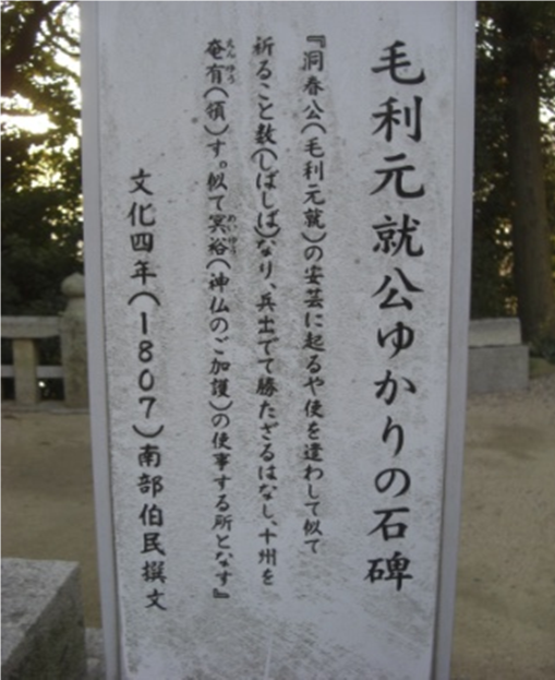 弘治元年(1555)十月、厳島の戦いで陶晴賢を破り自刃させた。その後、大内氏の残党を弘治三年、この地、富田に軍を出し勝栄寺に本陣を置いて鎮圧した。