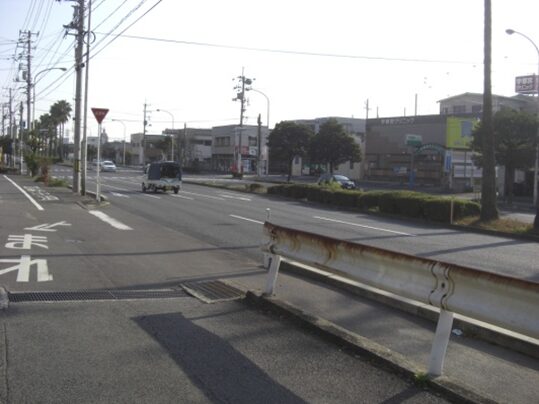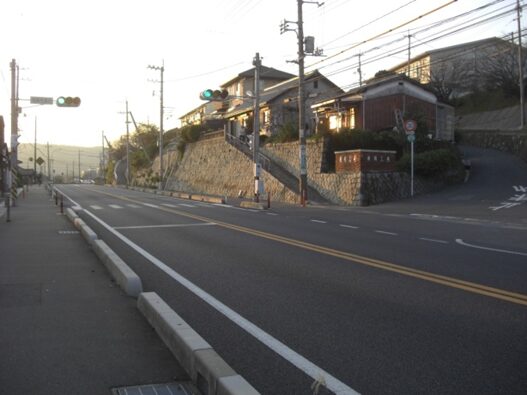 もう少し347号線の東の信号から見た写真です、347号線の削られた景色がよくわかります。信号の前方に坂が見えます、信号辺りから右の高台へ斜めに上っていました