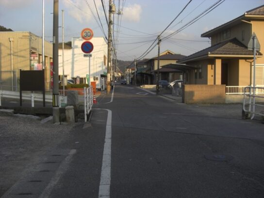 大安寺前から250m程進むと信号交差点に出ます、その手前右角に新南陽政所郵便局があります。その手前の左T字路に鹿野街道が分岐します。山陽道は真っ直ぐ進みます