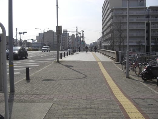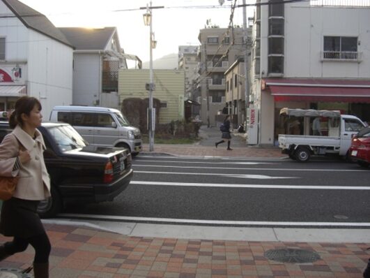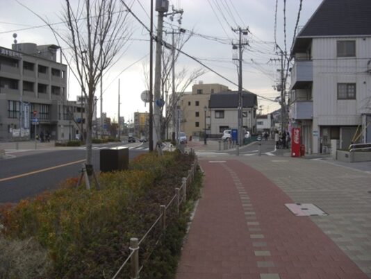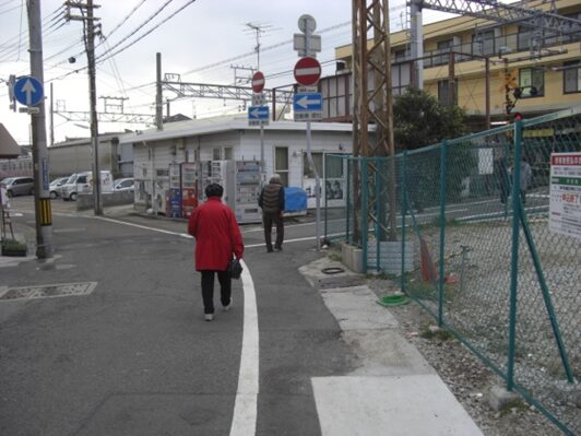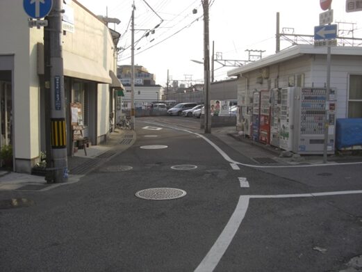 右に折れた辻より200mほどで左JR須磨駅、右山陽電鉄山陽須磨駅を結ぶ道路と交差します。