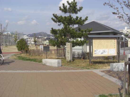 天正九年(1581)池田信輝・輝政は、現在の切戸町から中之島の中央市場にかけて、東西・南北とも約140mの城郭を築城、江戸時代に入り元和三年(1617)尼崎藩領となり陣屋がおかれ、明和六年(1769)幕府領になると大坂町奉行所に所属して与力や同心の勤番所となった。幕末に入り兵庫裁判所から兵庫県庁が開かれたが間もなく移転し、その跡地の中を1874年新川運河の開削により城跡の中心地は完全に失った。今はこの碑により存在を知るのみ