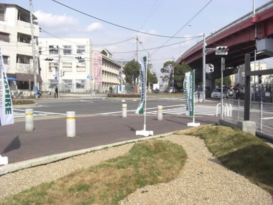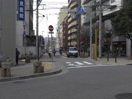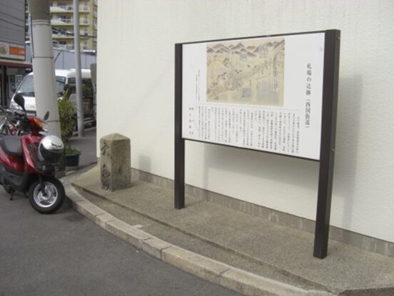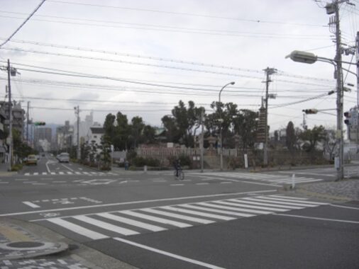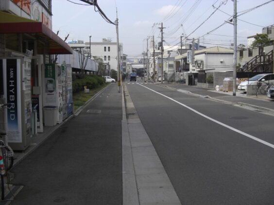 道標のところで広い信号交差点です、道路は分岐しますが山陽道は高架道路の方です、高架もこの先で切れています。分岐の交差点右の道と小学校の西南角の道標の間に旧道があります。この旧道は 白川街道で大山寺に通じています
