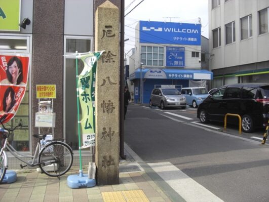 街道に戻り須磨区北町と南町の間の道を進んでいくと右角に 厄除八幡神社の石碑が建つ