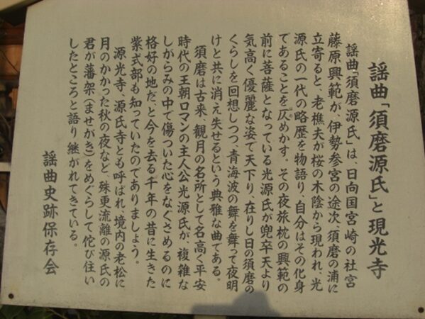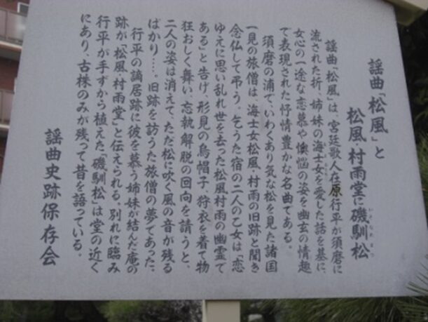 謡曲「松風」はじめ多くの文学に取り上げられている。村雨の二人の姉妹にまつわるお堂で、伝説在原行平(平城天皇の孫で在原業平の兄)が光孝天皇の怒りにふれ須磨の地に流され三年間この地に暮らす。寂しく暮らしていた時、多井畑(ここより北に1㎞)の村長の二人の姉妹との出会い話が伝わる。行平と親しくなり娘たち姉に「松風」妹の「村雨」の名を与え仕えてもらった、やがて許されて行平は都に帰ることになります