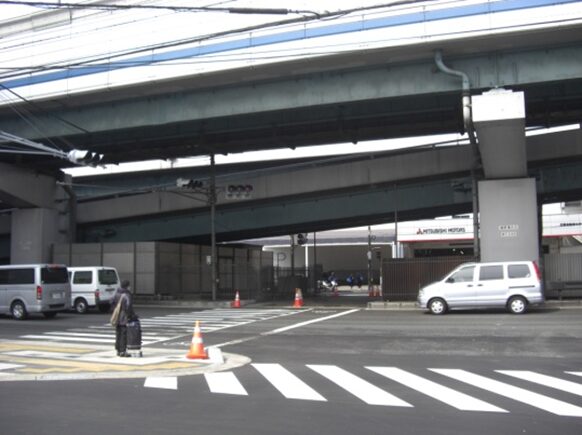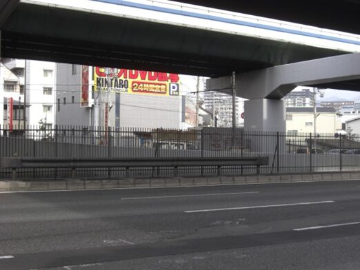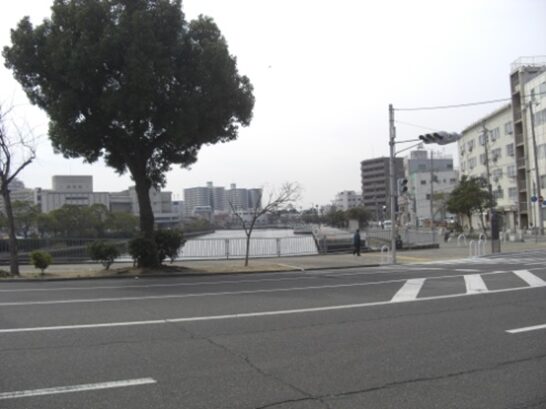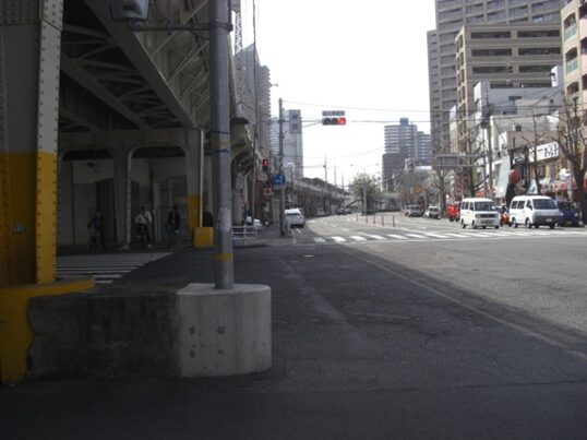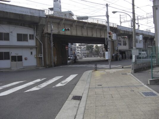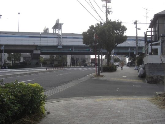 元の街道に戻り戸政町と中島町の間の街道といっても広い道を進むと、戸政町4丁目信号交差点に出ます。阪神高速道路の高架で高架手前は天井川に架かる橋があります
