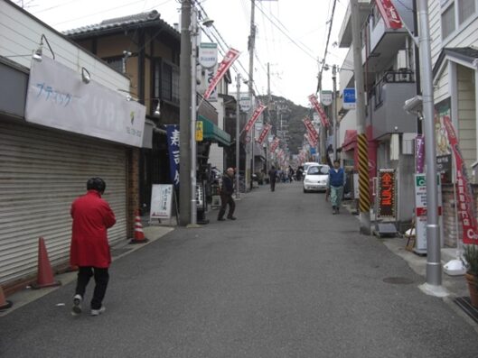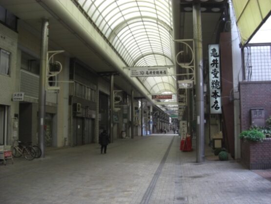 商店街を進むと明治五年創業の亀井堂本店 名物「瓦せんべい」