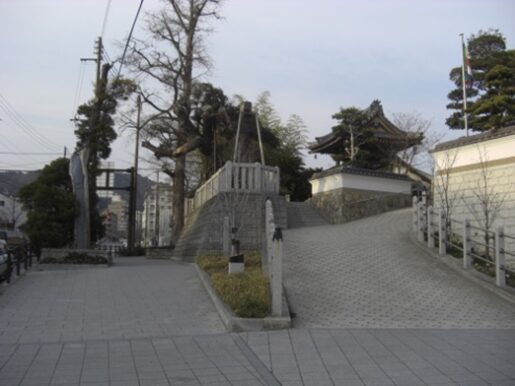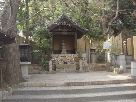 神社入り口右手に 平経俊の墓 平清盛の甥で一の谷ノ戦いで戦死した敦盛の兄でここで源範頼の郎党に敗れ戦死、18歳の若さであった