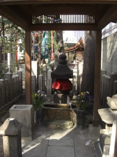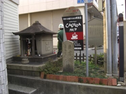 北向地蔵から北に150m道を入ると信号交差点がある右角にローソンの辻、左(西)に100m余り進むと生田神社の東門の方に出ます。