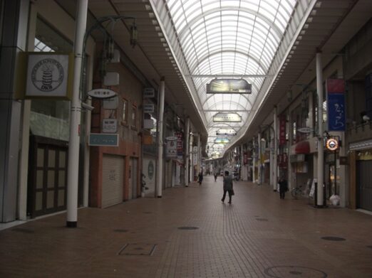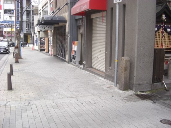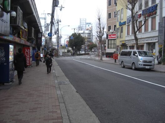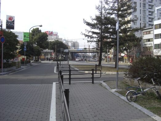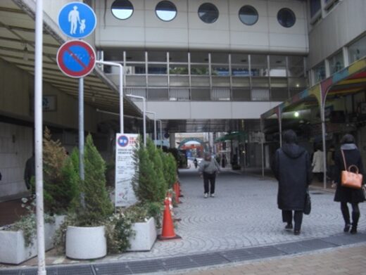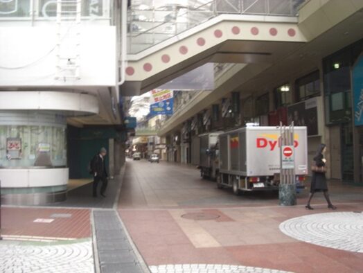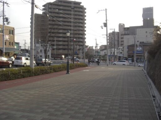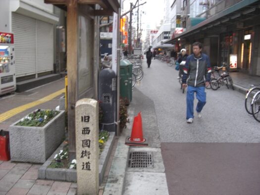 高架を抜け交差点を横断するとセンタープラザの西館・本館の間の繁華街を進むと現在版、山陽道。