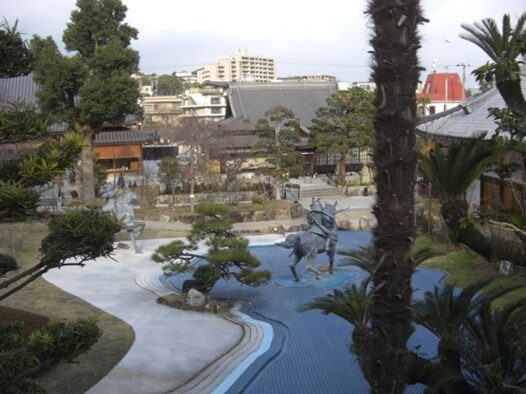 源平の庭 本堂に向かって進んだ左に、平敦盛と熊谷直実の一騎打ちの姿が再現されています
