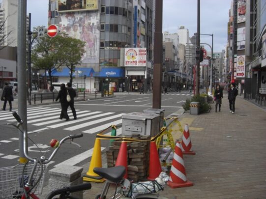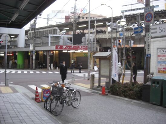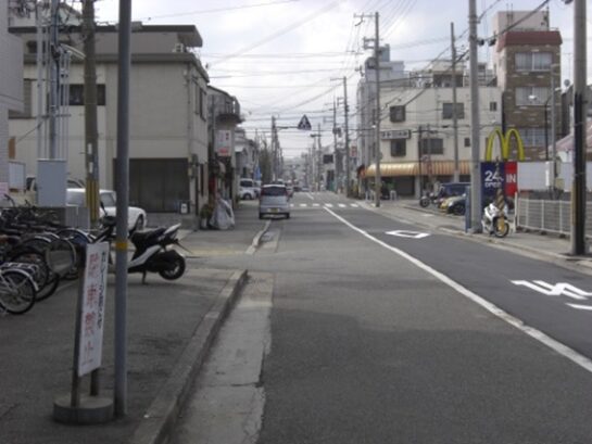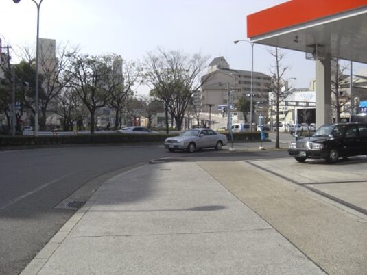 高架ガードを潜り左へ少し進むと、広い道路が北から西に折れる交差点があります、西北角にマクドナルドがあります