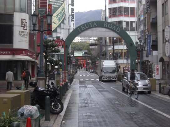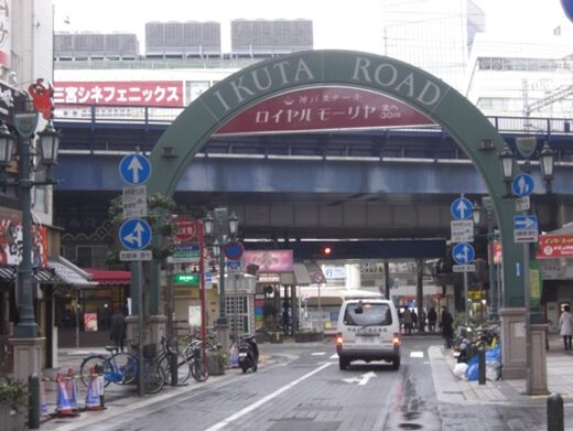 生田神社の正面を南へ、右に東急ハンズを見て西出口1の信号交差点の広い車道に出ます。左からは前述の北向地蔵から西への車道を200m余り進んできた交差点です。交差点を横断して南へ進む生田ロードアーチを潜りJR線の高架を潜ります