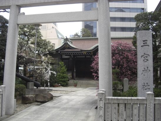 右に折れて進むと左に大丸神戸店が見え北東角の斜め向かいに 三宮神社 生田神社の裔神八社の一つで一宮から八宮まで市内に鎮座する。明治初期までこの付近一帯は田園風景が広がり、うっそうとした樹木が生い茂った鎮守の森であったというが今では想像もつかない。