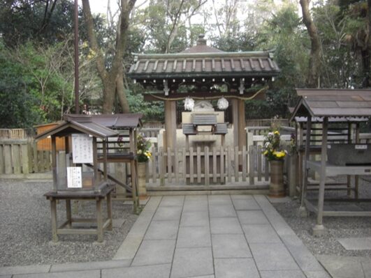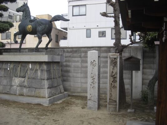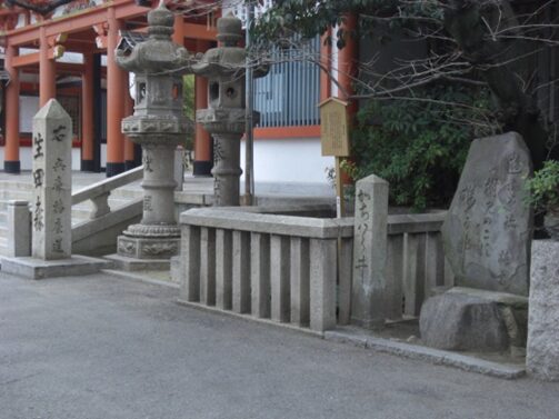 梶原の井(かがみの井) 源平生田の森合戦のおり梶原景季がこの水を飲んで生田の神に武運を祈ったと伝わるまた、謡曲「箙」(えびら)とは梅のことで梶原景季の様子が出てきます。梶原井と楼門の間、山陽道沿いにあった