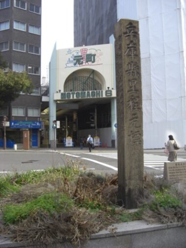 広場の中に 兵庫県里程元標 が立っています広場の右側には山陽電鉄神戸高速線の西元町駅が地下に、また左の角は旧三越跡