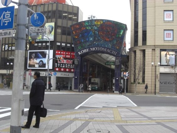 その先、左角に立つ大丸百貨店がある元町通り信号交差点を横断します。正面のアーケードのある賑やかな元町通り商店街を元町1~7まで町筋を進みます。大丸の南側一帯は 旧居留地 です