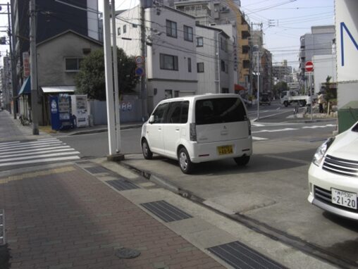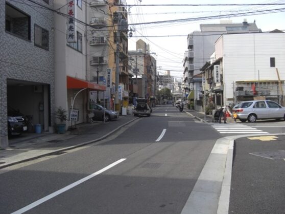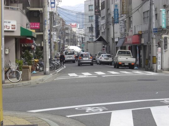駅前に立って左(南)を見ると線路に沿った道を含め、4筋目の信号のある手前への一方通行の道が山陽道復活し、そこを南に200m程進むと広い道の信号交差点を横断、さらに100m程進むと広い道を横断します、相生町5で50m弱先の交差点、新開地西国街道ビルの南東部に大きな 西国街道(山陽道)の道標