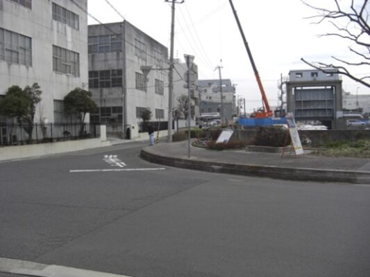左に折れて80m程で新川運河に突き当たります。正面角に花崗岩の重量4トンもある直方体の巨石