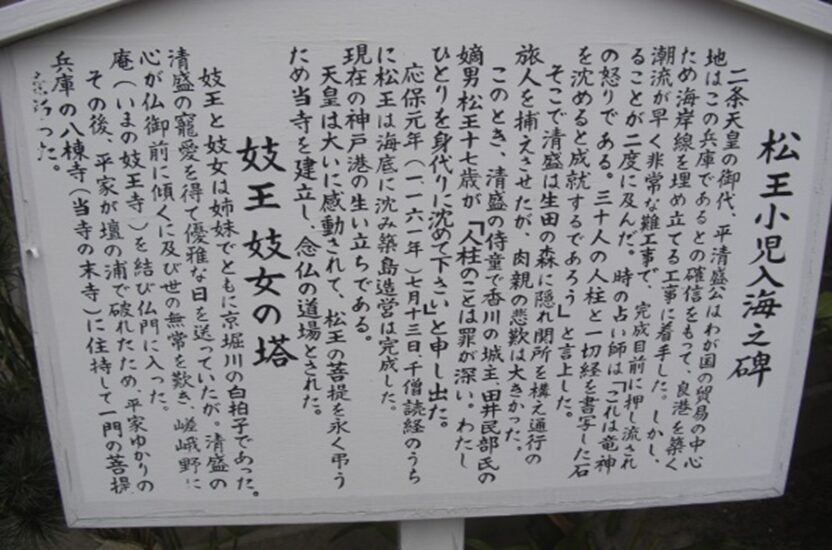 平清盛が承安年間(1171~75)、経ヶ島の築造がなかなか進まず、清盛の小姓であった17歳の松王丸が人柱となって身をささげ無事経ヶ島が完成。その島の上に現在島上町ができて地続きとなっている。境内に松王丸の供養塔と清盛が愛した白拍子祇王と祇女の五輪塔があります