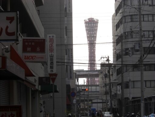左(海側)を見るとビルの間に神戸港に立つ神戸ポートタワーが見えます、近くに幕末の海軍操練所跡があるが寄れなかった