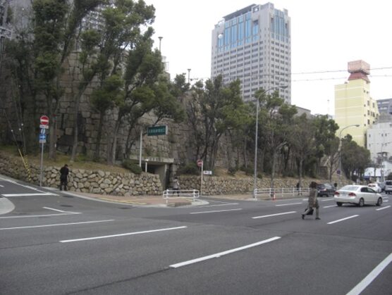 合流して100m程進むと信号交差点に出ます、東西に地下鉄海岸線が交差しています。交差点を横断して50m程進むと広い信号交差点に出るので右に折れます。正面に神戸朝日ホールの建物があります