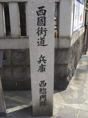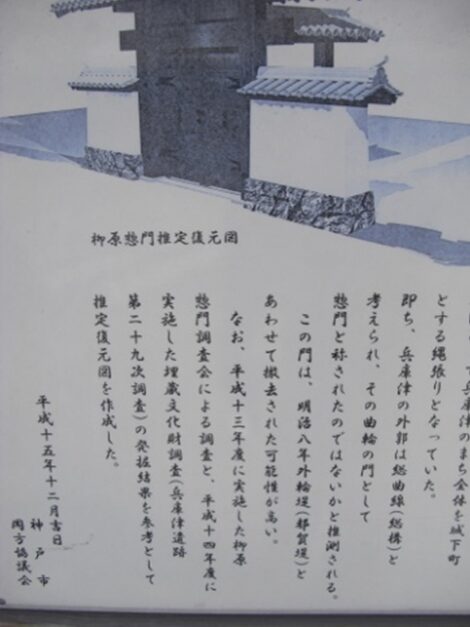 西国往還に設けた兵庫の出入口の惣門で、東より相生橋を渡り相生町を経て市電気局前を通り、この惣門に入り兵庫津の湊・江川・木戸・木場・小物屋・北仲の諸町、今の所謂兵庫本町を進み、南仲町今の神戸商業銀行の前を右折れし、小廣・神明・逆瀬川・東柳原・西柳原の町々を過ぎ、柳原口にあった柳原惣門を出て斜めに今の長田交又点に出る、そし花隈城を攻略しその功によって兵庫を治め兵庫城を築く。その後徳川時代に入り兵庫宿が整い様相が変わった