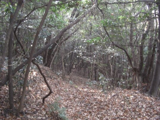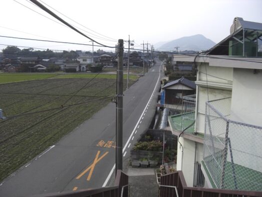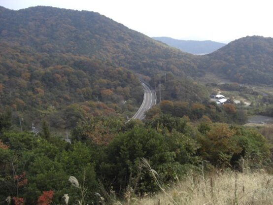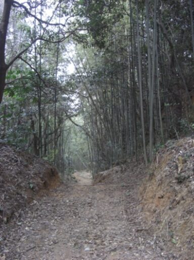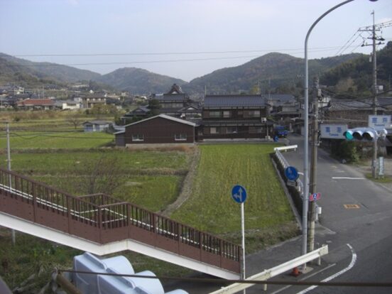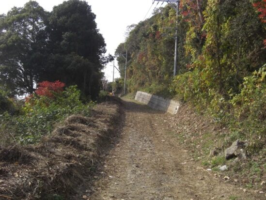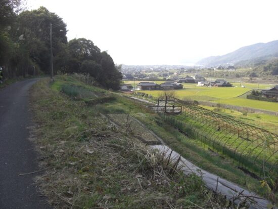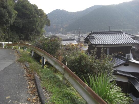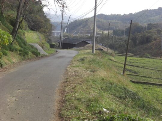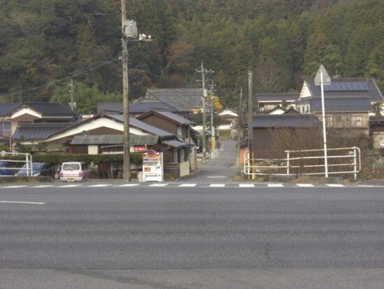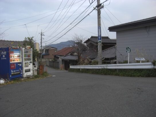 坂の途中より右手の歩いてきた矢地市の町方向を振り返る
