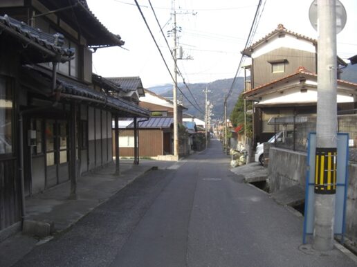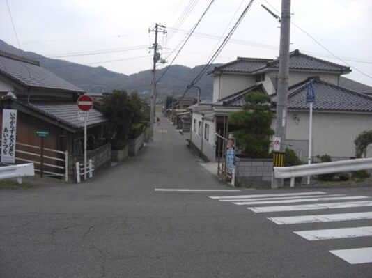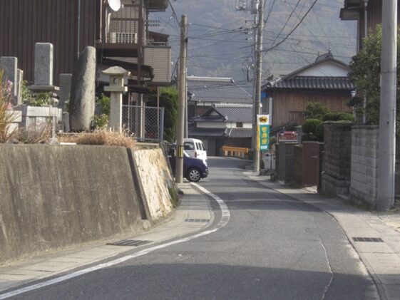 山陽道と萩往還を重複して西に100m程進むと幅の広い道が狭くなる左に