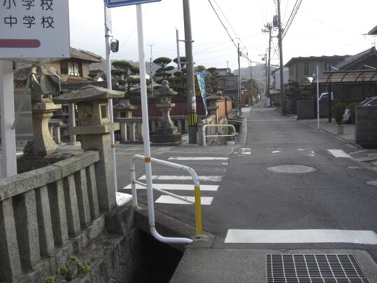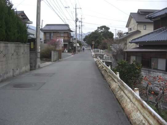 らんかん橋の過ぎたところから振り返る向かって右が防府天満宮への萩往還、左が山頭火の小径。らんかん橋の東側を入っていくと、種田山頭火が通った松崎小学校があります