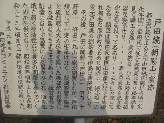 柳橋を渡り街道は真っ直ぐ進みますが、右に折れたさき左に 戸田焼(朝陽山)窯跡の案内板 が立っています