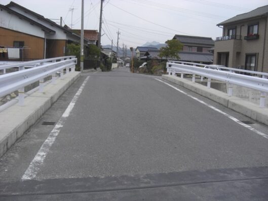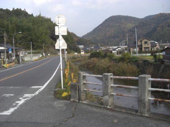 その先、左から夜市川が接近して、川に架かる御姫橋が左にあります。街道は橋を渡らず、右に折れ、左の夜市川に沿って進みます