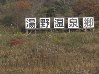北側の山腹に湯野温泉郷の案内が見えます