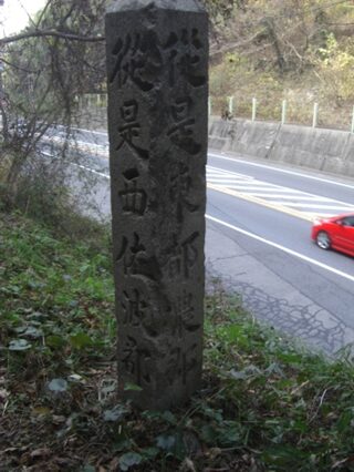 郡境界碑を少し進むと道は消失しているので右下の国道に下ります