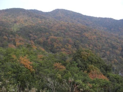 御姫橋の袂から右手方向に見える若山(217m)は陶氏の居城 若山城跡 室町時代の山城跡