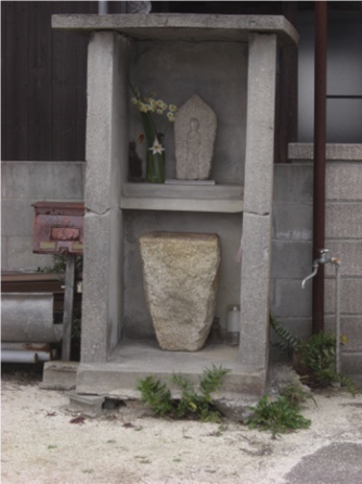 集落の中を抜けていきますと、新川が右に接して沿います、その新川を背にして、小さな 灯籠と祠