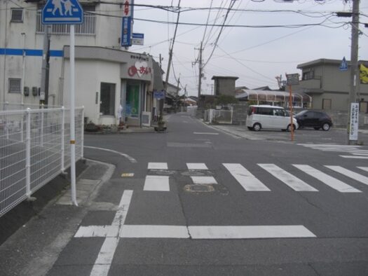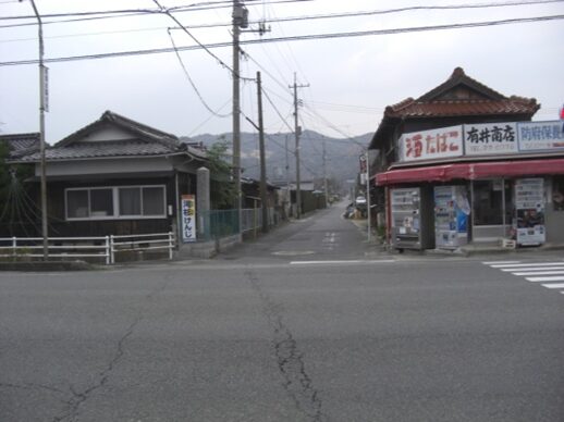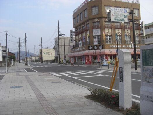 交差点右手前角に有井商店があります。また右に折れる左角に 国衙道標 「史跡周防国衙跡」昭和十二年の銘