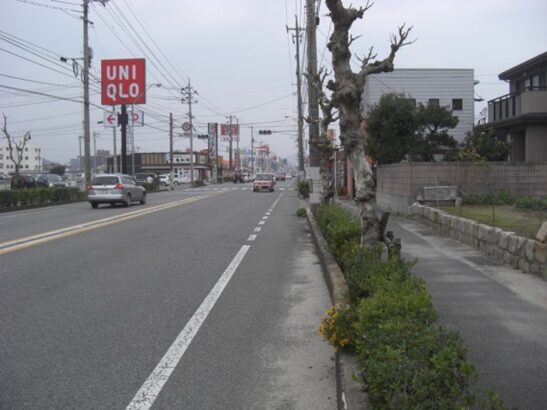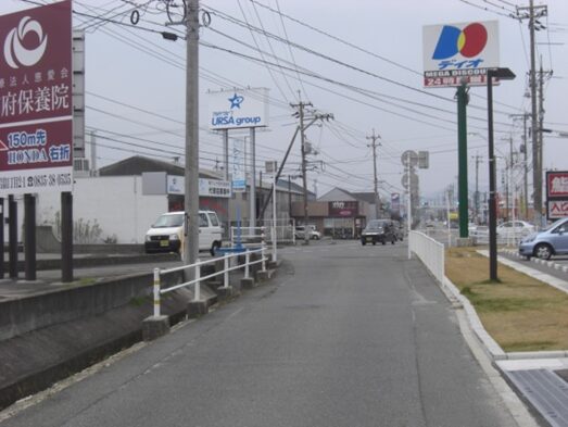 54号線に合流した先、左に国府中学校を見てさらにその先左に山口トヨペットの前を通り、合流点から700m程真っ直ぐ進むと、左にユニクロのある、国衙跡信号交差点に出ます