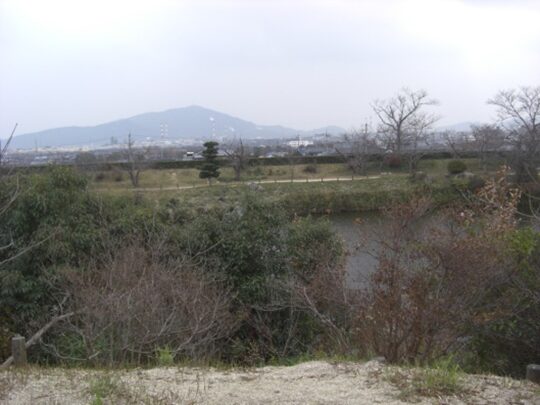 邸宅より見える正面(南側)の池、その向こう側は国衙跡