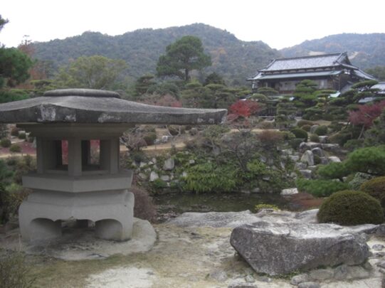 お城の門をくぐような、路傍庭園を進んでいくカエデ・ツツジが見事に並ぶ。丘あり、滝あり、せせらぎあり、起伏にとんだ25.000坪の広大な庭園。