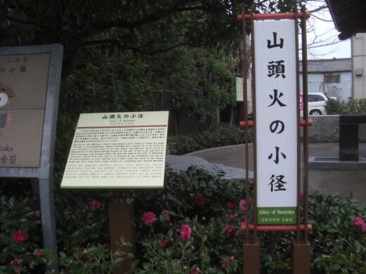 「うまれた家はあとかたもないほうたる」の句碑がたつ山頭火生家跡から宮市の裏を抜け防 府天満宮参道のらんかん橋付近に至る「山頭火の小路」は、山頭火が母校松崎小学校へ通った道です。山頭火が幼年期に慣れ親しんだこの小路、昔ながらの風情をしのばせ、道々の軒下には、「昭和の芭蕉」と呼ばれた、放浪の俳人・種田山頭火の句の札が架けられています