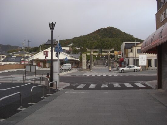鳥居前のT字路正面は防府天満宮と背景の天神山(166.9m)