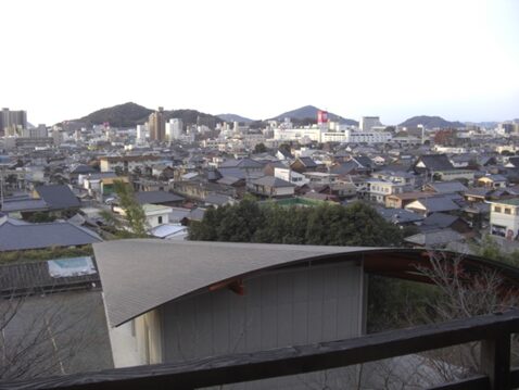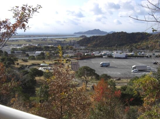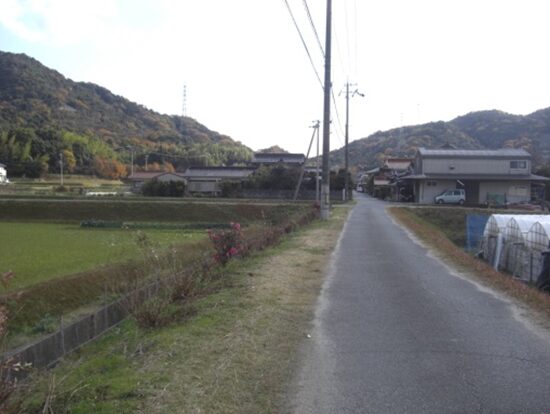 左手の山並みが霞んでいて見えにくいが左 火ノ山(252m)、右少し頭が傾いたような 陶ヶ岳(303.6m)の美しい山並が望める。その向こう側が瀬戸内の海なので内陸部を歩いています