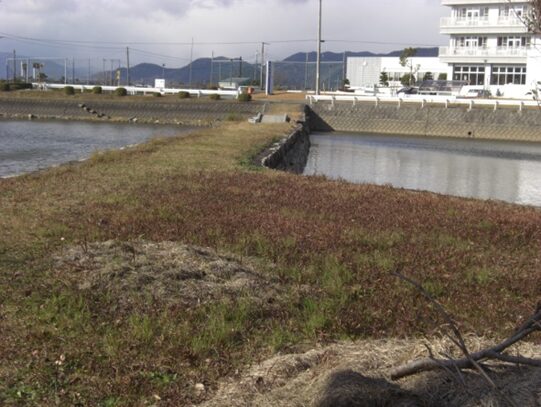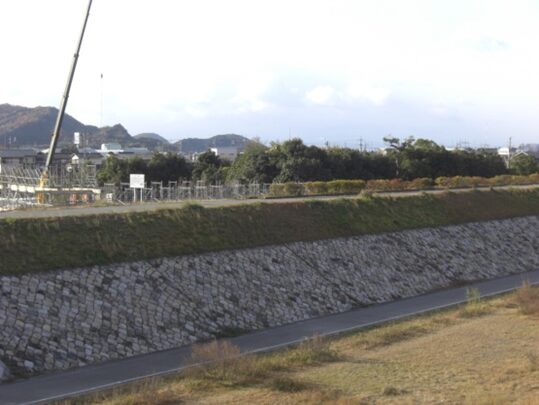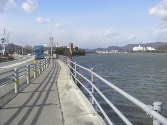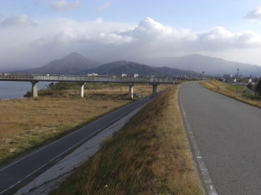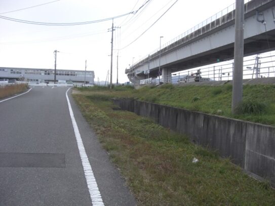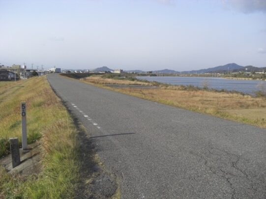 すぐ先、左にフードセンターはやしを過ぎ、少し歩くと小さな川を渡ります、その先も道なりに南西に暫く進みます。右にマンションが見えるところで、再び小さな川を渡ると、佐波川の堤防が見えます。堤防に上り右からの道と合流して左へ堤防道を進みます