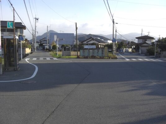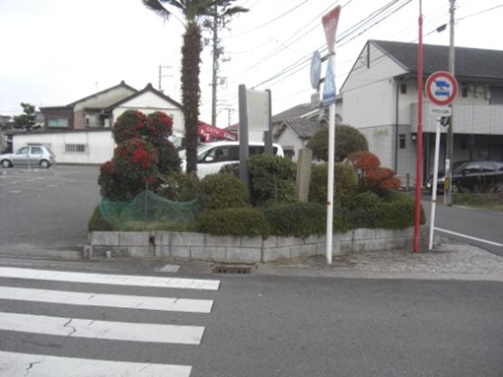 300m程進んでいくと信号交差点に出ます、街道は真っ直ぐ進みます。交差点の左角(南東)の駐車場は、