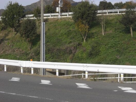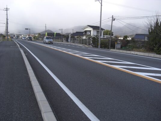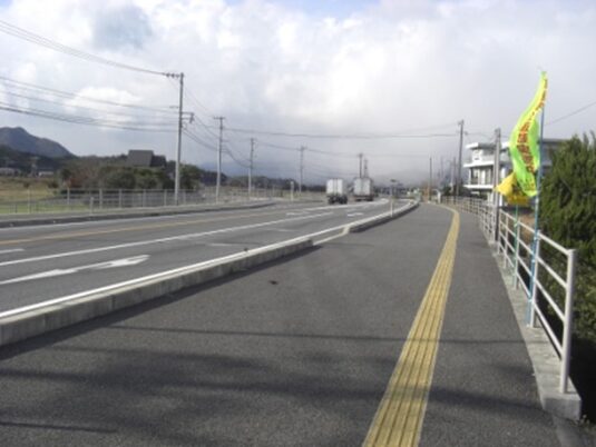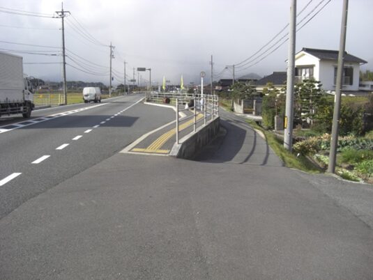 交差点を横断して暫く進み、左に防府新橋郵便局を見て車道の交差点を横断します。そのすぐ先で道なりに左にカーブして南西に方向を変えます
